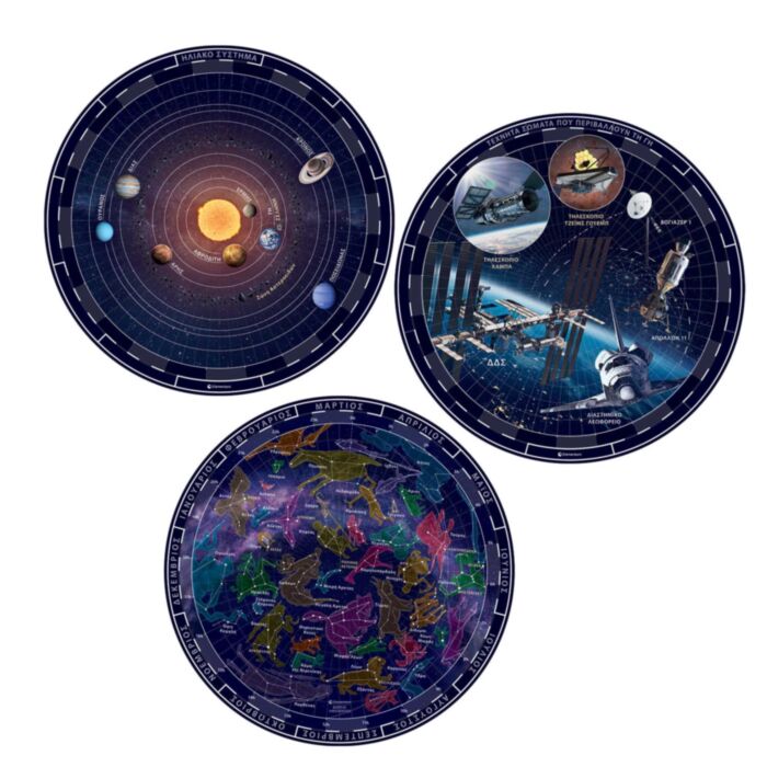 Εξολοκλήρου φτιαγμένο στα ελληνικά, με παραπομπές στην ελληνική μυθολογία και αναλυτικό εγχειρίδιο με πληροφορίες για τα προβαλλόμενα θέματα. Συνεργαζόμενο App με αφηγήσεις σχετικές με τα τρία θέματα προβολής , διαδραστικά κουϊζ που «στέλνουν» το λύτη στο διάστημα με εκτόξευση πυραύλου, κάρτες επαυξημένης πραγματικότητας που σκανάροντάς τες προβάλλονται στην οθόνη του κινητού εικόνες 3D με προσομοίωση πραγματικών συνθηκών στο διάστημα, παρεχόμενες πληροφορίες σε info box και προβολή πραγματικών εικόνων, των πλανητών, των αστερισμών και διαστημικών αντικειμένων.