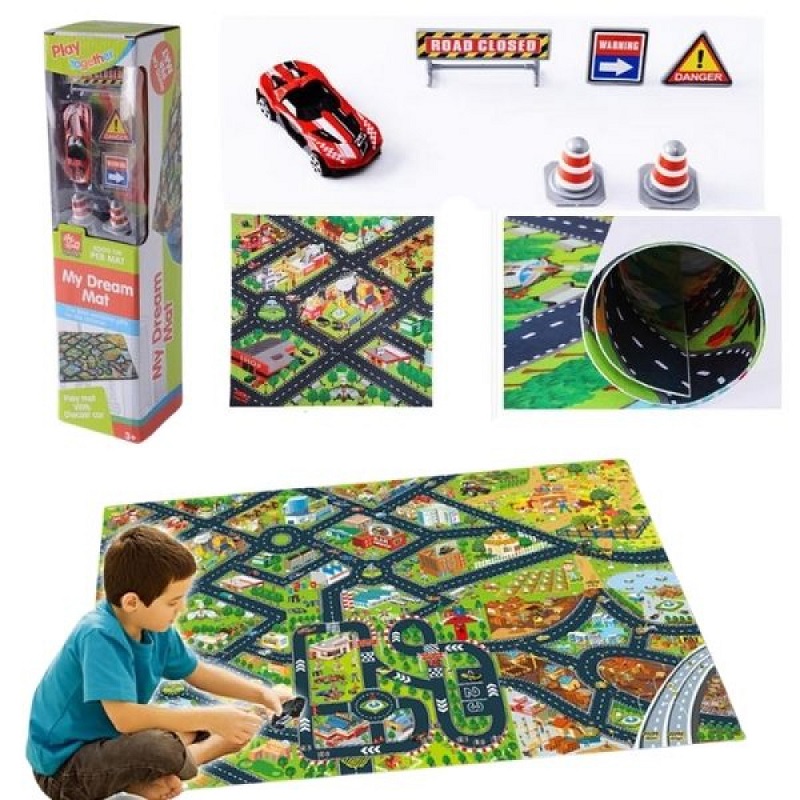 Μαλακός και ανθεκτικός τάπητας παιχνιδιού με σχέδιο πόλης, με όχημα και οδικά σήματα.